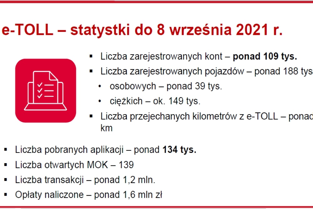 Do systemu e-TOLL zostało już dopuszczonych 65 dostawców, którzy oferują ponad 270 typów urządzeń OBU i ZSL. Aplikację mobilną e-TOLL PL można pobrać bezpłatnie w sklepach Google Play oraz App Store. Liczba pobrań aplikacji przekroczyła 134 tys.