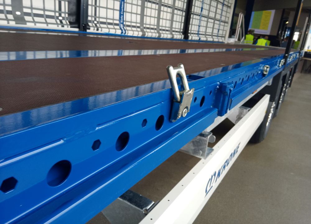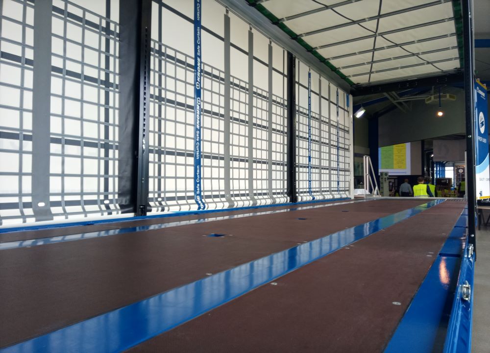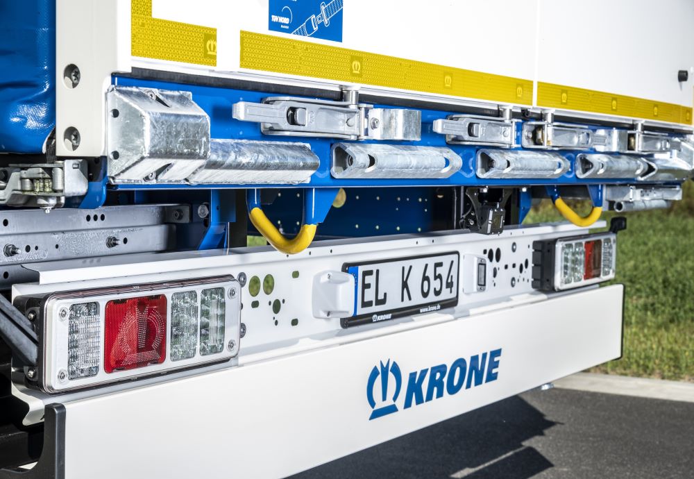 Na życzenie Krone wyposaży Mega Linera w kurtynę Safe Curtain zabezpieczającą ładunek. Posiada wytrzymałe pasy ze stali w pionowych kieszeniach tunelowych z PVC zintegrowanych z bocznymi zasłonami. Zaleta: ponieważ klasyczne listwy (deski) nie są już potrzebne, nie tylko obsługa kurtyny Safe jest łatwiejsza, bezpieczniejsza i szybsza, ale także zmniejsza wagę o około 100 kg - w porównaniu z konwencjonalnymi kurtynami bocznymi. Oczywiście kurtyna Safe Curtain spełnia wymogi dyrektywy Daimler w zakresie zabezpieczenia ładunku 9.5 i jest certyfikowana zgodnie z normą EN 12642 Code XL, a także do transportu napojów.