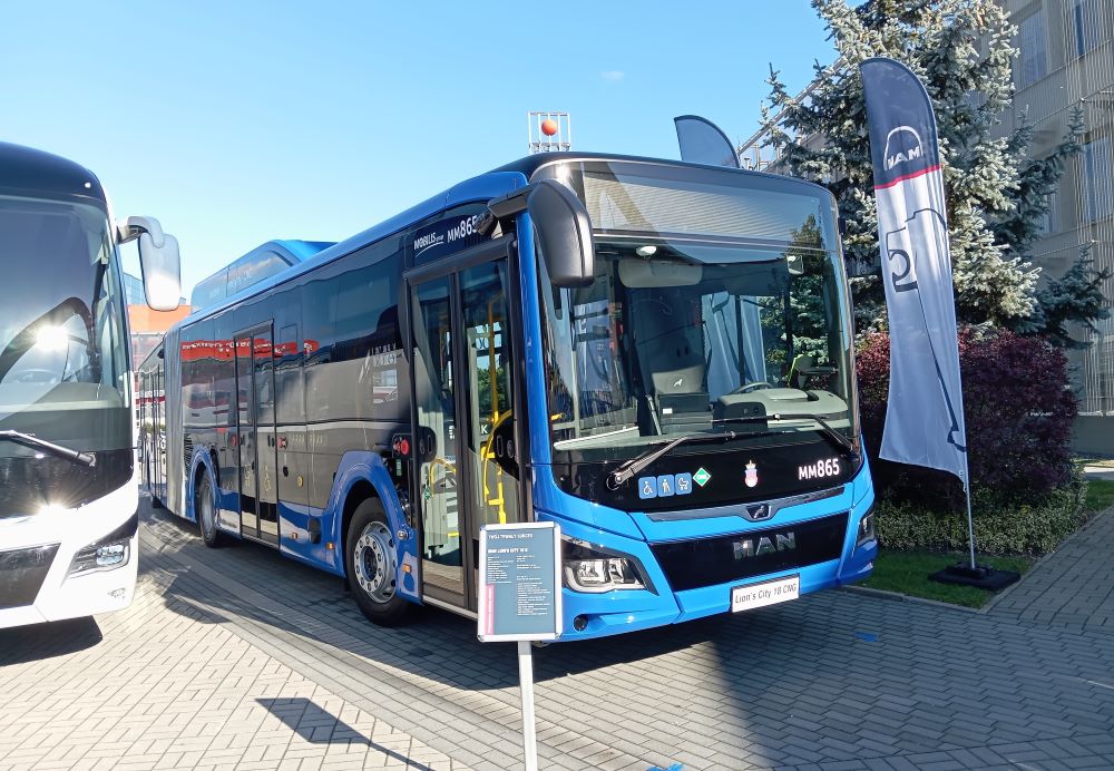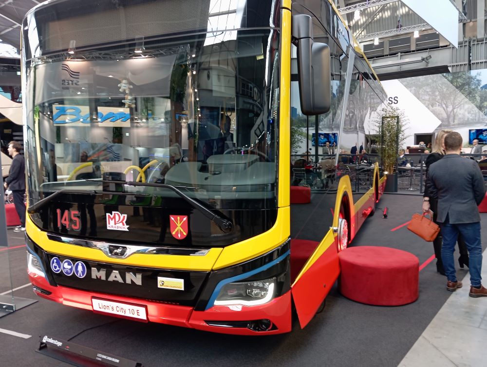 Wicelider naszego rynku, MAN, przywiózł do Kielc niskoemisyjny autobus o bardzo dużej pojemności dla komunikacji miejskiej – MAN Lion’s City 18 CNG, przeznaczony dla krakowskiego oddziału Mobilis (przewozi 150 pasażerów), a także zeroemisyjną technologię w kompaktowej, 10-metrowej wersji – MAN Lion’s City 10E z MPK Kraśnik. Przed największą halą stał także dwupokładowy autokar Neoplan Skyliner (w barwach Bomatur), uhonorowany prestiżową nagrodą „Polski Bus 2023”, i autobus turystyczny MAN Lion’s Coach, MY24 GSR .