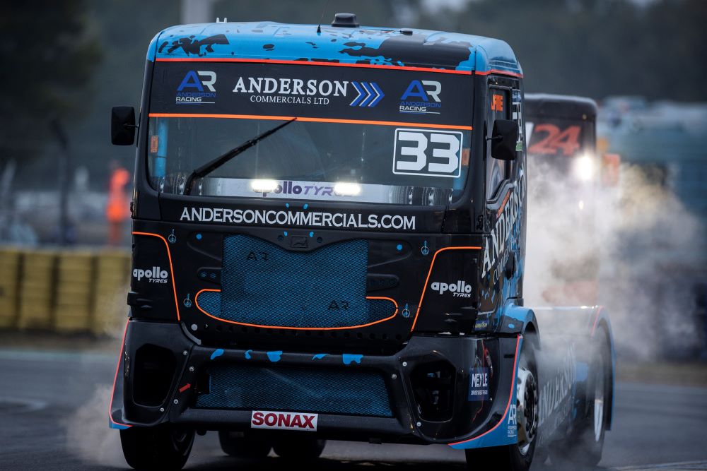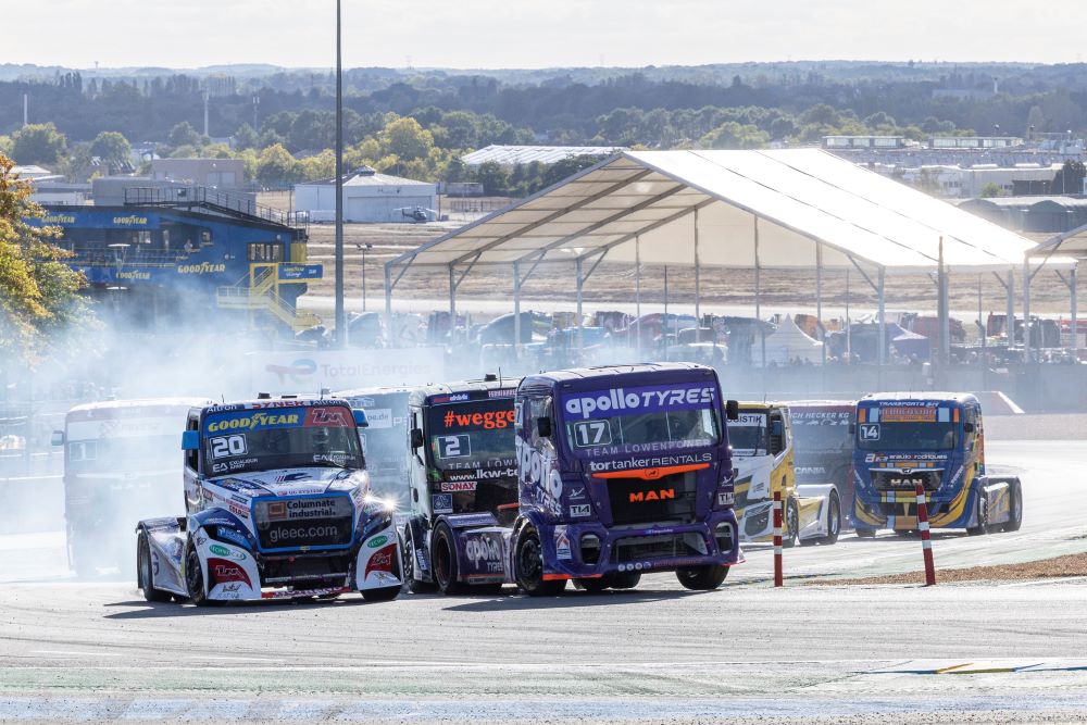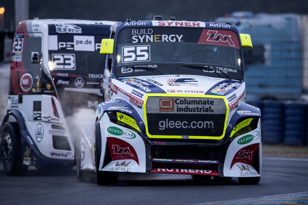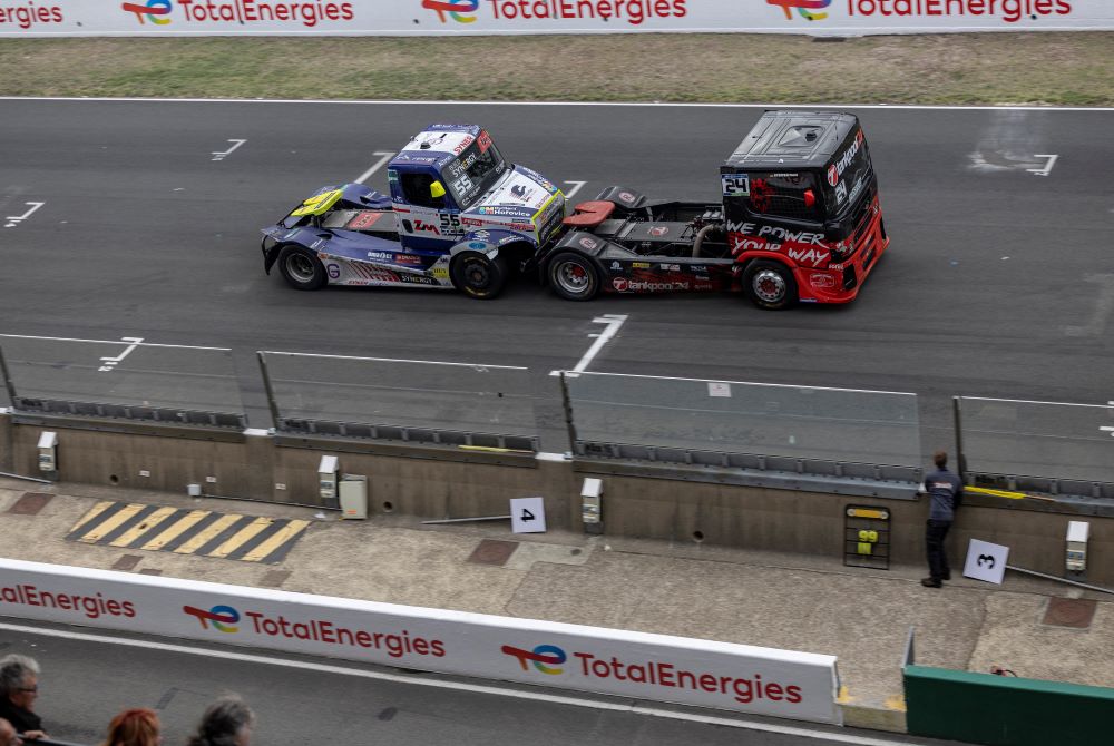 Adam Lacko na Freightlinerze za późno zabrał się za walkę o tytuł drugiego wicemistrza, więc musi czasem szarżować...