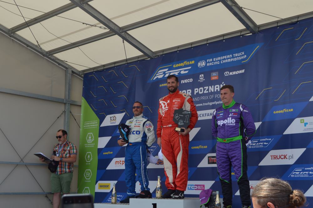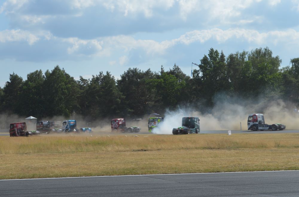 A w niedzielę nie padało, jak chcieliby niektórzy. Dlatego dysponujący najszybszymi maszynami Kiss, Hahn senior i Lenz spokojnie powtórzyli sobotnie wyniki. Ciekawie było za ich plecami, bo dwa razy w ramach walki na zakrętach kilka maszyn opuściło tor, kręcąc bączki na trawie i wzbudzając mnóstwo kurzu. Kurz jest widowiskowy ale zderzenia metalowych elementów ciężarówek – groźne. Znowu Albacete wylądował na trawie z pourywanymi plastikami i częścią orurowania. Co gorsza także drzwi kierowcy ucierpiały i mechanicy musieli błyskawicznie ratować MAN-a, by dojechał samodzielnie do mety. Ale wyszło to na dobre sympatycznemu Antonio. Bo startował przez to z drugiego rzędu i mógł wywalczyć swój jedyny w Poznaniu puchar. Tuż za nim dojechali Lenz i Kiss.
