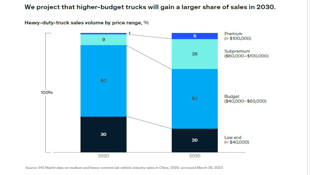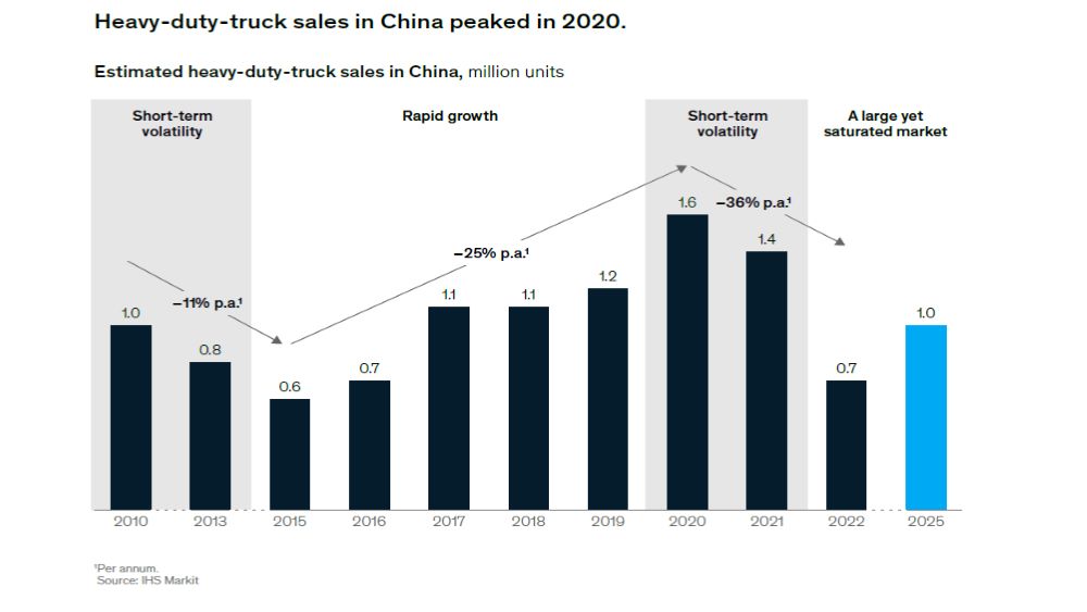 W ciągu ostatniej dekady Chiny doświadczyły boomu infrastrukturalnego i rosnącego popytu na transport drogowy, co doprowadziło do szybkiego wzrostu rynku samochodów ciężarowych o dużej ładowności (HDT). Sprzedaż HDT w Chinach wzrosła z 600 000 pojazdów w 2015 r. do najwyższego poziomu 1,6 mln w 2020 r. Następnie w 2022 r. rynek HDT w Chinach uległ załamaniu; regionalne spowolnienie gospodarcze, blokady związane z pandemią COVID-19 oraz fakt, że wielu klientów dokonało przedsprzedaży pojazdów HDT w latach 2020 i 2021, przełożyło się na wielkość sprzedaży w 2022 r. wynoszącą zaledwie 700 000 pojazdów .