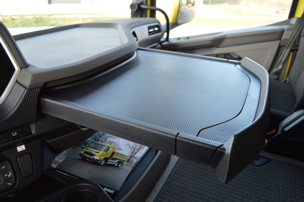 O komforcie pracy decyduje m.in. nowy układ kierowniczy i sama kierownica odchylana daleko na czas wsiadania. Także nowy fotel, który można regulować wzdłuż na 25 cm, a na wysokość o 14,5 cm. Kokpit jest wzorcowy, słynie z tego DAF. A tu, choć to tylko mniejsza i dzienna kabina, z deski można wysunąć potężny stolik pozwalający na wygodny posiłek albo wypełnianie dokumentów. Prawy fotel kinowy składamy w górę i wtedy osiągamy największą korzyść z okienka drzwiowego.