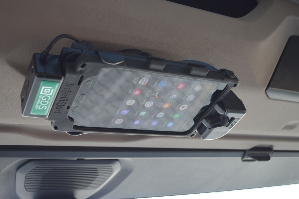 Natomiast nad stolikiem, nad deską rozdzielczą, zauważamy tablet przymocowany do podsufitki. Wyjmuje się go po zakończonej pracy i zabiera do biura albo domu, gdzie można wszystkie programy zaktualizować.