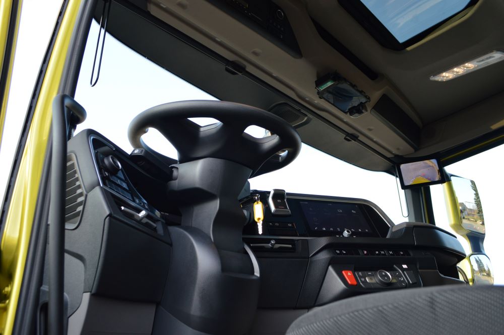 Wystarczy porównać ją z każdą inną nową kabiną generacji NGD, jak wiadomo przedłużoną w oparciu o nowe przepisy o wymiarach samochodów ciężarowych. Więc i ten stosunkowo mały pojazd ma kabinę o szerokości 250 cm i długości 203 cm. Jeśli porównać np z kabiną dzienną CF to jest szersza, ale znacznie dłuższa. Prawie 26 cm. Wchodzimy do niej po 3 stopniach, bo ma koła 385 /65T22,5 z przodu, a 315/80 z tyłu i ramę z profilami o wysokości 31 cm, wystarczającą by wozić spore ładunki.