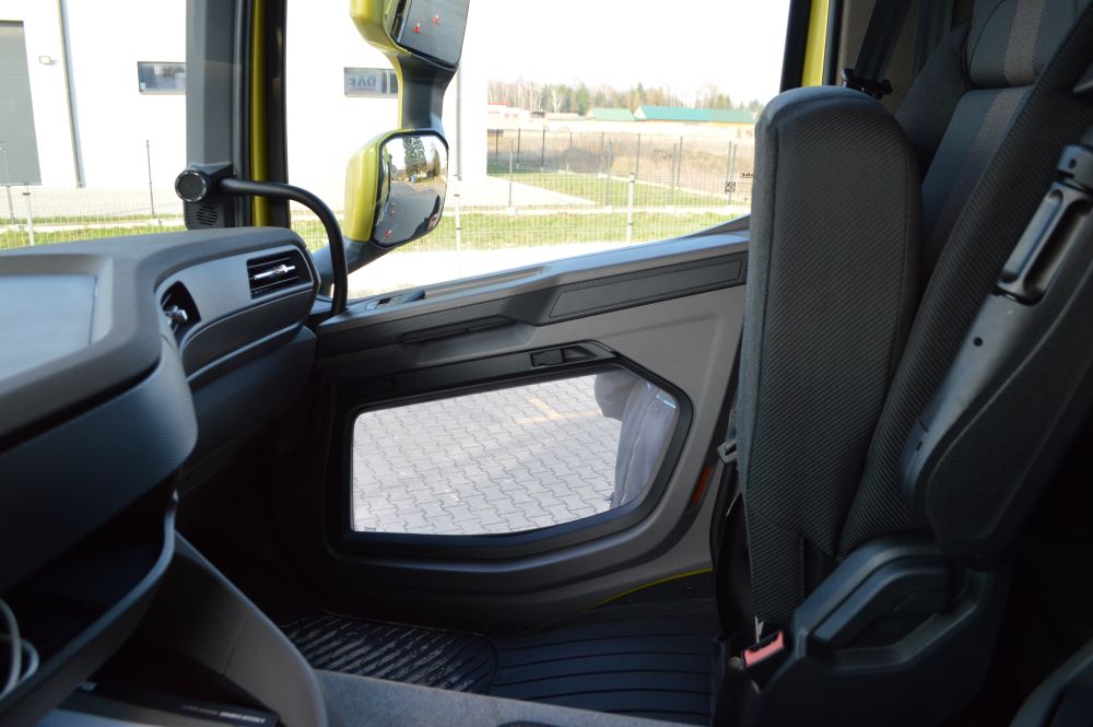 Dla przewoźnika najważniejsza jest ładowność, ale liczy się i to, w jakich warunkach pracuje kierowca. Tu zatem mamy bardziej przestronną niż dawniej i niż wielu konkurentów kabinę oraz potężną przednią szybę o powierzchni 2,3 m2, zagiętą na słupki A. W dodatku deska rozdzielcza, niemal identyczna jak w XG, ale tylko o 3 cm krótsza, pozwala na dobrą obserwację okolic samochodu. Pomaga tu stary wynalazek francuski, teraz wykorzystany przez Holendrów, a zwany Vision Door. W miastach i na placach budowy naprawdę się przydaje.