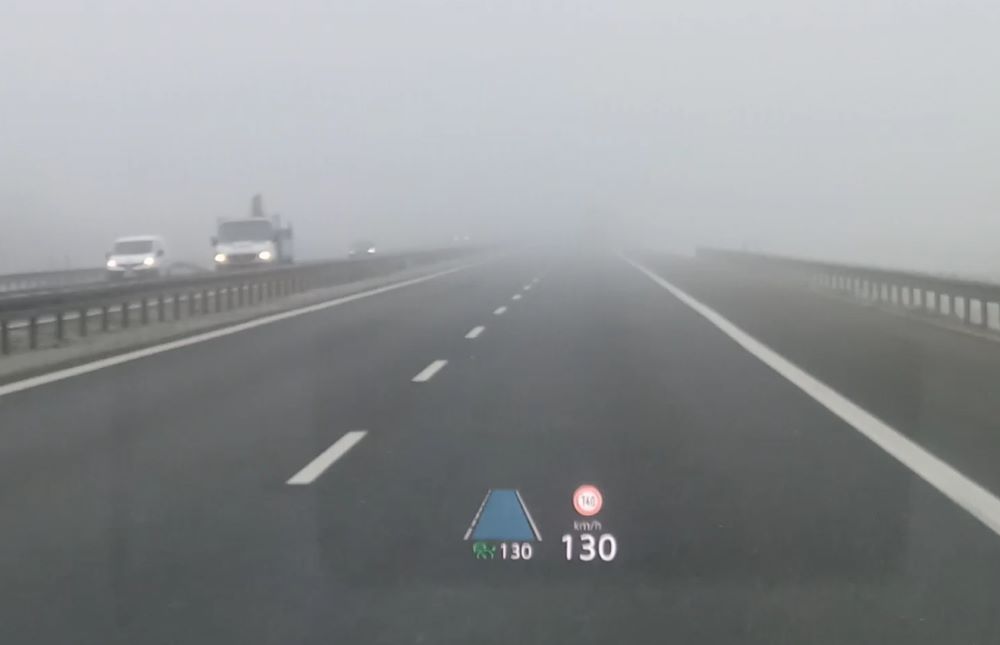 Natomiast wyświetlacz HUD rzuca na przednią szybę obraz składający się z kilku danych. Domyślnie jest to prędkość faktyczna samochodu, prędkość systemu ACC oraz ikona znaku drogowego określającego prędkość na tym odcinku drogi. Gdy jednak ACC jest nie aktywne, jego prędkość znika, więc obraz na HUD się zmienia.