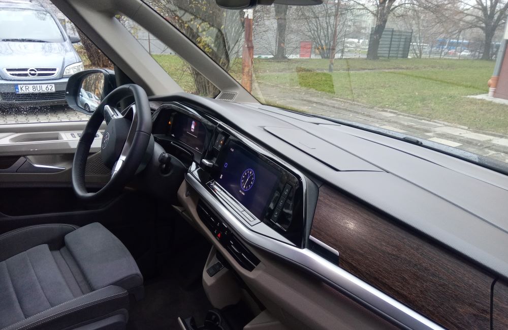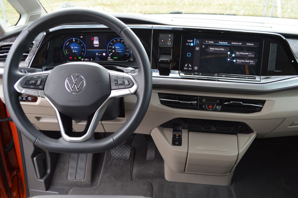 Najnowszy kokpit Multivana Style to bardzo elegancki zestaw miękko poprowadzonej górnej deski i sprytnie wkomponowanego pod to zestawu cyfrowego kokpitu Pro, z dwoma dużymi wyświetlaczami, a między nimi przełącznika napędu.