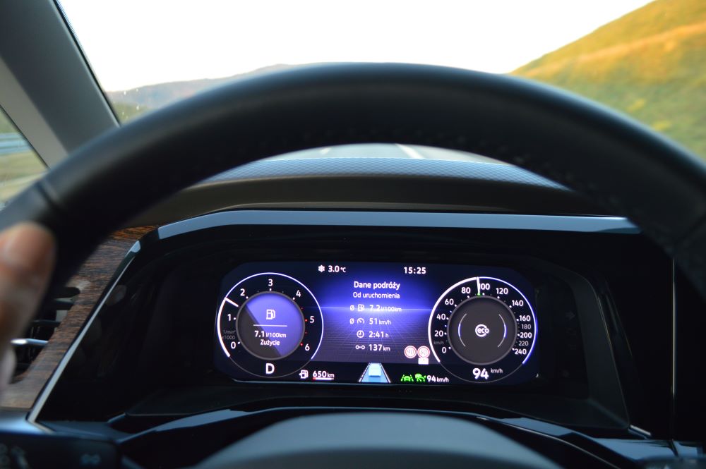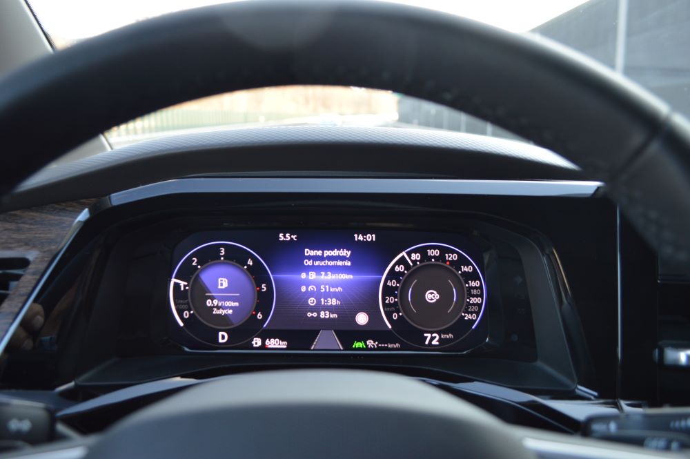 Wsiadając nie zauważymy minimalnej różnicy wysokości podłogi, odruchowo uwaga kierowcy kieruje się raczej na opanowanie funkcji infotainment na dwóch ekranach. Kto jeździł nowszymi Volkswagenami, dość szybko zrozumie filozofię, w myśl której możemy zmieniać zarówno zawartość dwóch okrągłych zegarów, jak i głównego pionowego wyświetlacza między nimi. Operowanie przyciskami na kierownicy prowadzi do indywidualnego ustawienia danych na obydwu zegarach.
