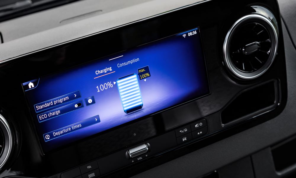 Najnowszy eSprinter otrzymuje pełny system MBUX. Został również zaktualizowany o własne szczegóły dotyczące pojazdów elektrycznych. Oznacza to, że będziesz otrzymywać dane w czasie rzeczywistym dotyczące poziomu naładowania baterii i zasięgu. W rzeczywistości Mercedes stworzył inteligentny interaktywny wskaźnik zasięgu, który łączy się z nawigacją. Daje dokładniejsze wyobrażenie o tym, jak daleko zabierze Cię ładowanie baterii.
