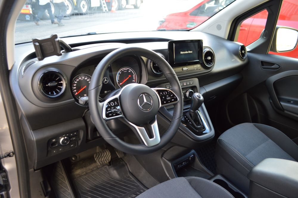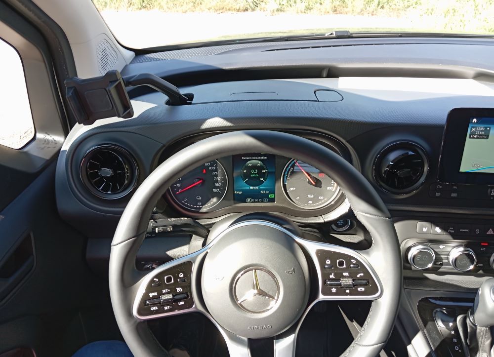 Jak łatwo zauważyć, samochody dwóch marek ( nawet 3, bo jest też Nissan) mają zupełnie inne deski rozdzielcze, głownie rozpoznawane po innych otworach wentylacyjnych. Jednak bardziej niż różnice wizualne liczą się różnice funkcjonalności. Mercedes ma swój system MBUX, znany z innych dostawczych samochodów MB, ale dopasowany do eCitana. Chodzi np o możliwość pokazywania na ekranie dostępnych w okolicy stacji ładowania baterii. Ma swoją elektronikę, która razem z MBUX daje choćby możliwości komend głosowych i słynnego „Hej Mercedes”.