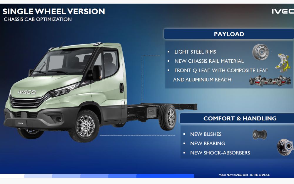 Model Daily ma zmienioną ergonomię wnętrza kabiny i technologię pokładową, a także nowe usługi łączności rozszerzone na całą gamę. IVECO odtąd oferuje nowe tylne zawieszenie piórowe o progresywnej sztywności, dostępne w wyposażeniu opcjonalnym.