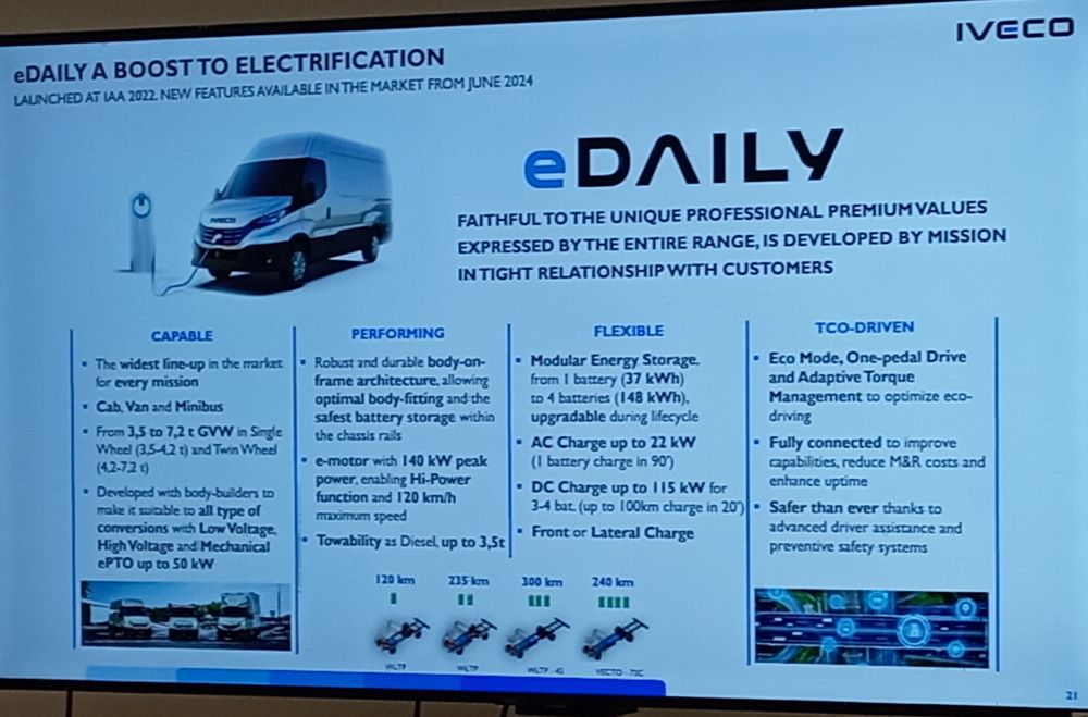 eDaily jest znany z innowacyjnej modułowej technologii akumulatorów, zapewniającej zasięg do 400 km w warunkach miejskich, a czwarty akumulator można teraz skonfigurować w modelach o masie całkowitej 7,2 tony i podwoziu z kabiną 5100 mm. Zwiększenie pojemności akumulatora do 148 kWh umożliwia uzyskanie zasięgu do 240 km. Modele IVECO eDaily z trzema i czterema akumulatorami otrzymują również szybsze ładowanie 115 kW, zapewniające 100 km zasięgu w zaledwie 20 minut. Ponadto podwozia zyskują możliwość doposażenia opcjonalnego w boczny port ładowania, aby zoptymalizować komfort kierowców.