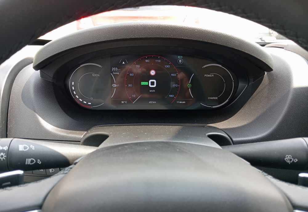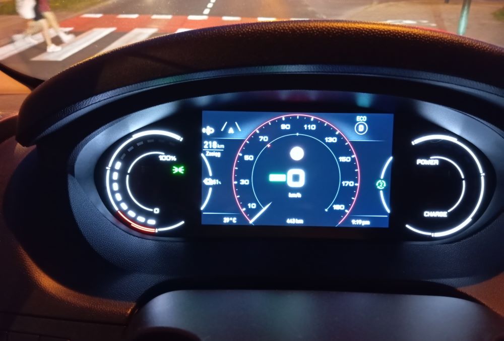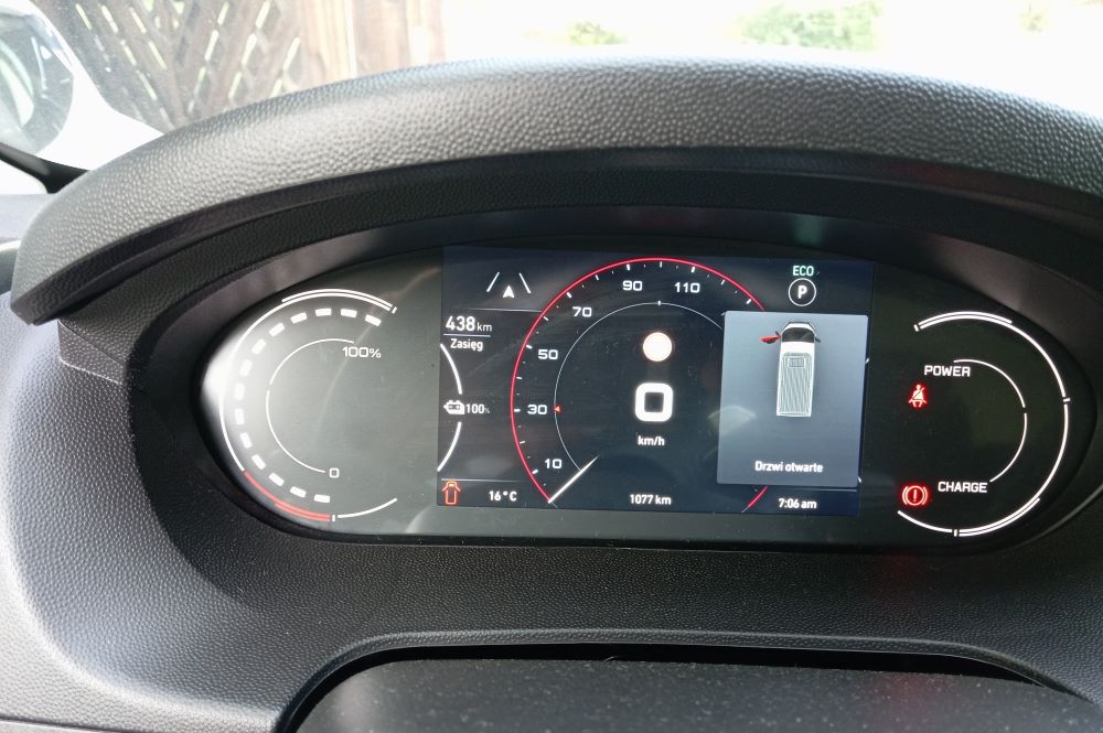 Po lewej stronie mamy białe koło z białymi diodami na obwodzie, pokazującymi stan baterii. Ponieważ tuż obok jest podany procentowy stan baterii, a wyżej szacunkowy zasięg, można uznać, że producent starał się mocno by kierowca nie przeoczył sytuacji zakończenia energii w baterii. Nie wiem czy lepsze są 3 osobne, ale małe informacje o naładowaniu, czy może jedna ale duża?
