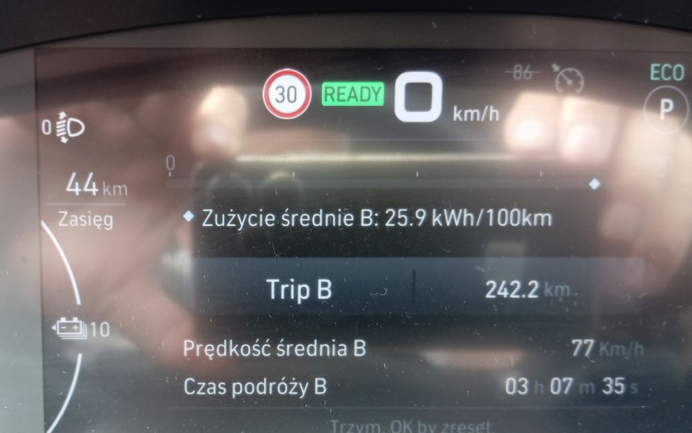 Np. przejazd z Gliwic do Krakowa, w większości autostradą, ale z umiarkowaną prędkością wymagał średniego zużycia 24kWh/100km. Innym razem pojechałem do Opola (A4) gdzie licznik pokazał średnią 24,3 kWh/100km. Przyznaję, trochę wymiękłem przy powrocie, bo nie do końca wierzyłem w zasięg szacunkowy, podawany przez komputer.