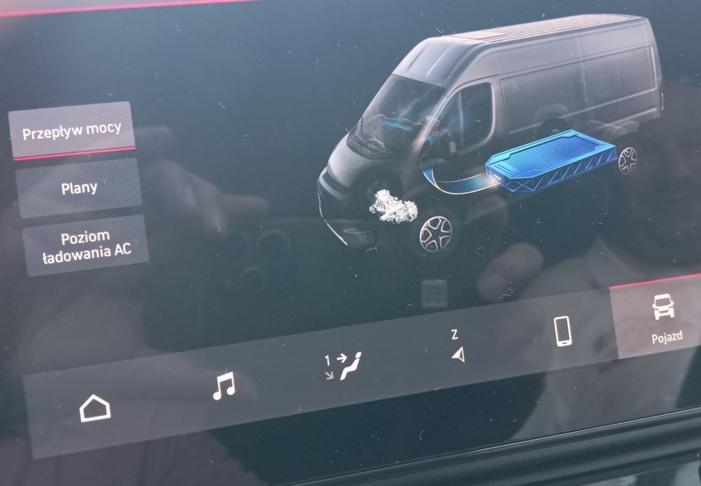 Natomiast na ekranie na środku kokpitu (kolorowy, dotykowy, 10 cali) znaleźć można ocean danych, od obrazka naszego Ducato z pokazanymi przepływami energii: do silnika albo do baterii, przez dane o ładowaniu, aż po „plany ładowania”, których na razie chyba jeszcze niewielu używa bo ładuje się po prostu wtedy gdy trafi się wolna ładowarka. Chyba że mamy już Walboksa w bazie…