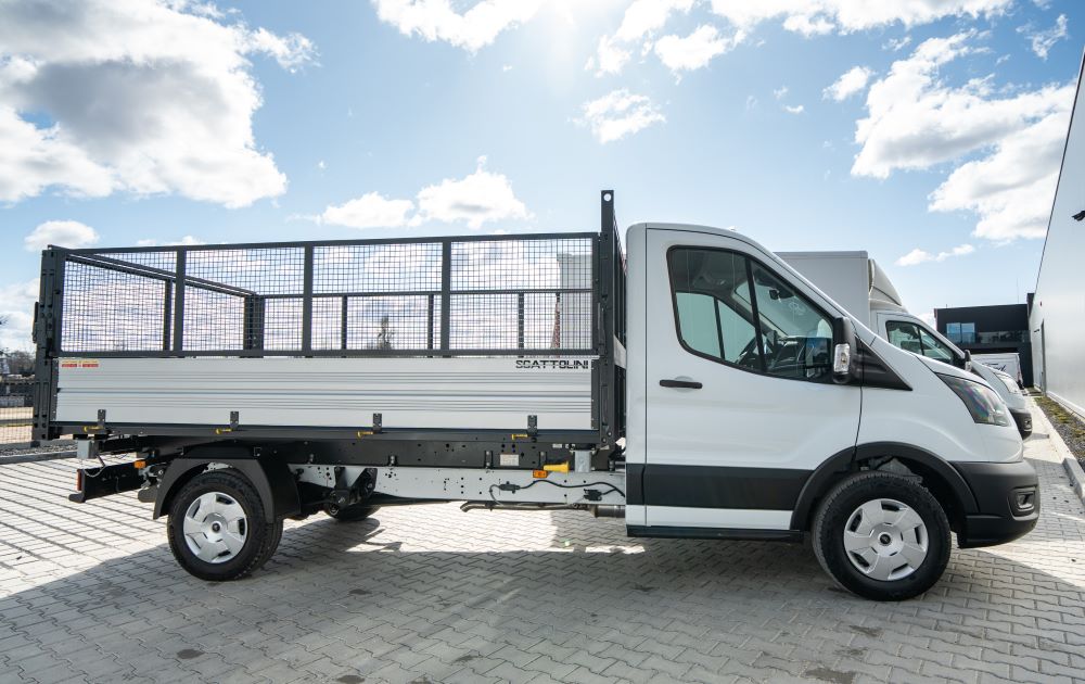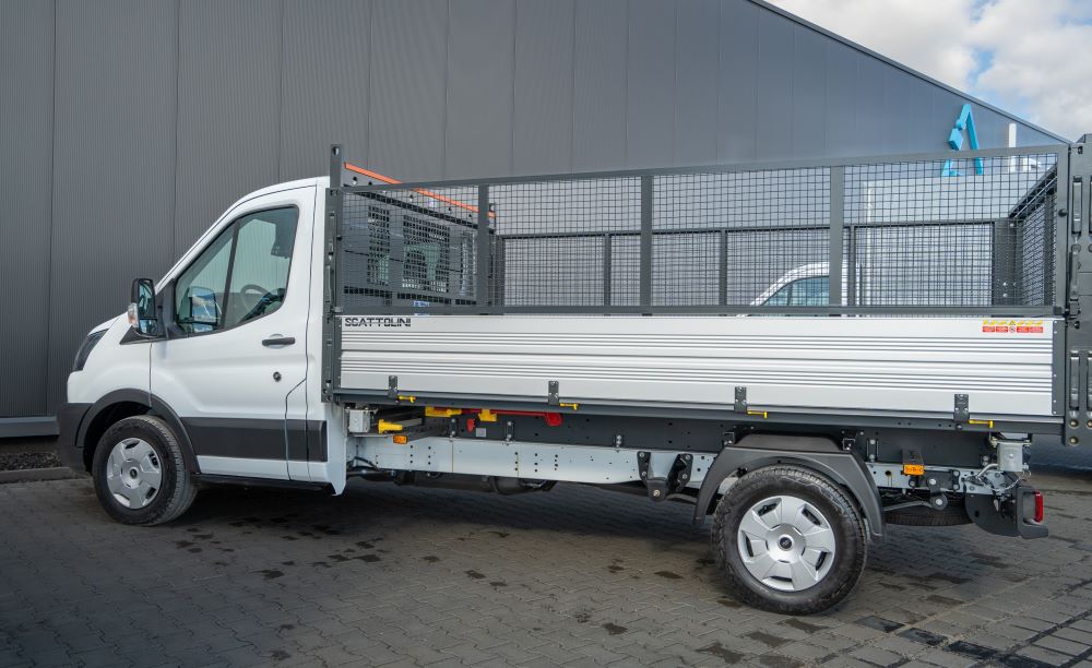Transit został wyposażony w zabudowę, której niska waga została uzyskana dzięki zastosowaniu ramy aluminiowej. Podłogę natomiast stanowią aluminiowe deski z frezowanymi otworami. Konstrukcję platformy uzupełnia otworowany reling boczny lakierowany w kolorze nadwozia - nośność na otwór to 1000 daN. Oznacza to, że jeden pas może zabezpieczyć ładunek o wadze 1000 kg.