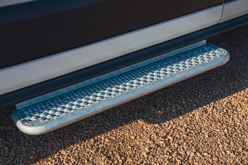 Najazdy aluminiowe mają długość ok. 220 cm i są wsuwane z tyłu. Bezpieczny załadunek zapewnia zintegrowane oświetlenie LED, zamontowane po wewnętrznej stronie relingu bocznego, które skutecznie rozświetla całą platformę roboczą.