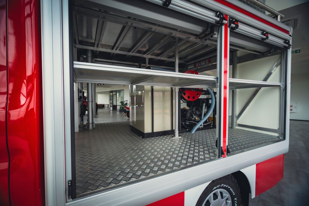 Samochód został uzbrojony w aluminiową zabudowę kontenerową. Konstrukcja została wyposażona w pięć rolet, które ułatwiają dostęp do tylnej części pojazdu. Na liście wyposażenia auta znalazł się między innymi wysokociśnieniowy agregat wodno-pianowy oraz teleskopowy maszt oświetleniowy ze źródłami światła w technologii LED. W tylnej części zabudowy umieszczona została drabinka. Całość uzupełnia oświetlenie wewnętrzne i zewnętrzne LED oraz elektryczna wyciągarka wbudowana w przedni zderzak.