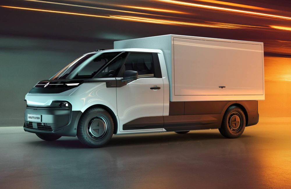 RENAULT GOELETTE E-TECH: Dzieląc tę samą platformę i kabinę co Trafic E-Tech, Goelette E-Tech wyróżnia się dużą zdolnością do przekształcania przestrzeni ładunkowej. Dzięki wzmocnionym osiom może przewozić ładunki o masie do 1,4 tony , co umożliwia jego dostosowanie w dowolny sposób . Historyczny samochód dostawczy Renault, Goelette, był na drodze od 1956 roku. Wytrzymały, solidny i łatwy w przebudowie, był jednym z najbardziej wszechstronnych vanów dla osób prowadzących działalność lub małych firm o szczególnych wymaganiach. Bezpośrednio wywodzący się z furgonetki Trafic , od której czerpie wymiary i konstrukcję kabiny (zewnętrzną i wewnętrzną), Goelette w pełni wykorzystuje elastyczność platformy „skateboard”, aby oferować kilka różnych wersji „fabrycznych”, takich jak na przykład podwozie z kabiną, skrzynia o dużej objętości lub przedłużona kabina. Podwozie z kabiną to gołe podwozie poza kabiną, które może być wyposażone w dowolne nadwozie oferowane przez przetwórców, aby sprostać konkretnym potrzebom różnych profesjonalistów. Podwozie może być wyposażone w skrzynię o dużej objętości, która może przekraczać 10 m3, nawet do 15 m ,w zależności od wymagań klienta.
