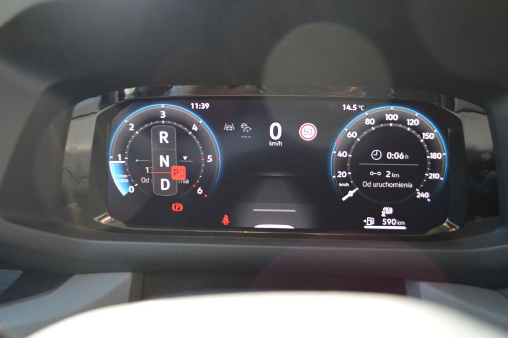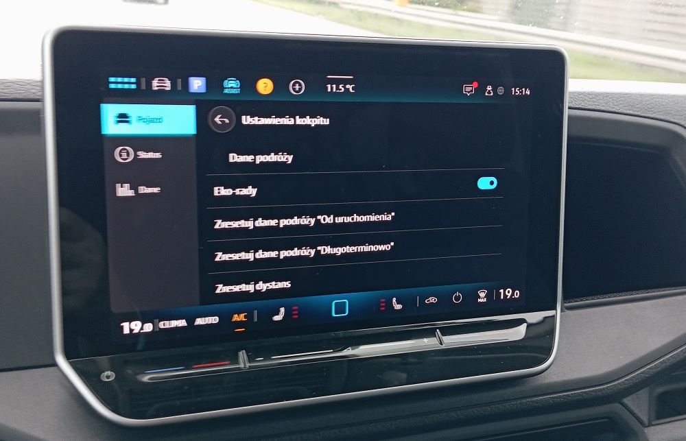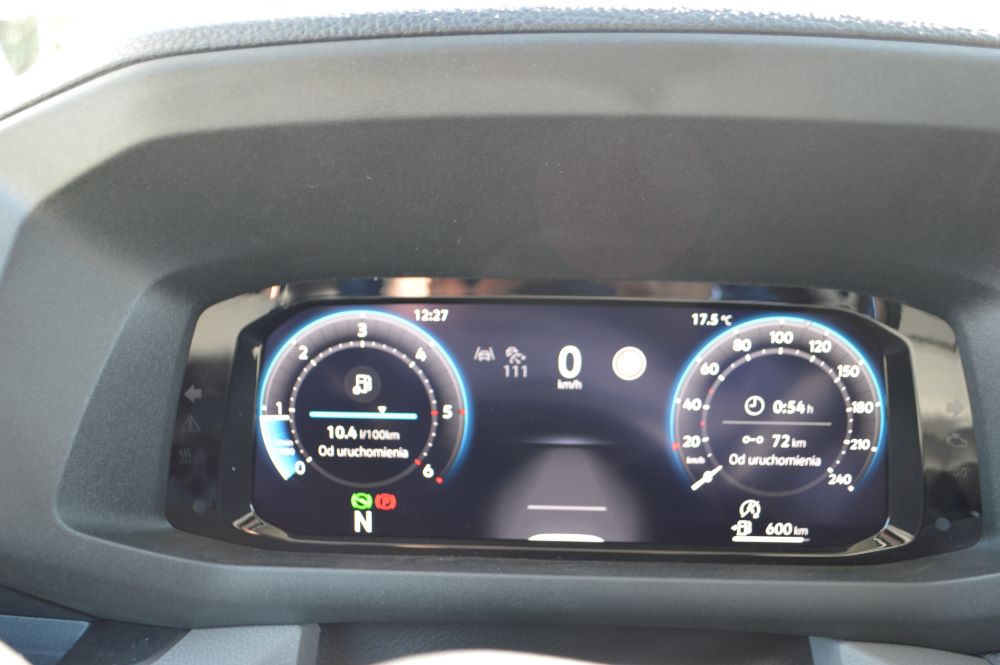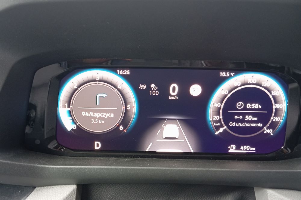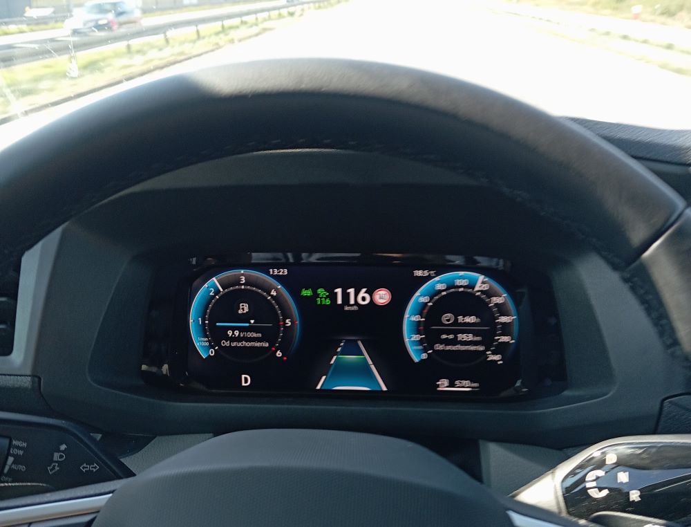 Skoro wspomnieliśmy o masywnym „zdygitalizowaniu” auta, to trzeba też dodać, że ma ono jakby dwa poziomy. Pierwszy to duży wyświetlacz na środku deski, wypełniony różnymi funkcjami i z dostępem do wielu systemów. To właśnie tu resetujemy dane przejechanej wcześniej trasy. To jest w sumie przyjemne, gdy stoimy na parkingu i mamy chwilę czasu. Ale prawdopodobnie wielu kierowców sięga po te rzeczy w czasie jazdy i choć ekran jest dobrze ulokowany, to obserwowanie go i dotykanie jednak odwraca uwagę. Można zakładać, że tylko część użytkowników będzie sięgała po te regulacje. No ale skoro coś jest dostępne, to musimy też zakładać, że pewna grupa będzie regularnie obsługiwała funkcjonalności na ekranie infotainmentu. Z kolei możliwość skonfigurowania wyglądu, czyli treści, wyświetlanej na głównym ekranie może się podobać, choć zrozumienie procedur wymieniania poszczególnych sub-ekranów przyjdzie łatwiej tylko tym, którzy jeździli już Volkswagenami.
